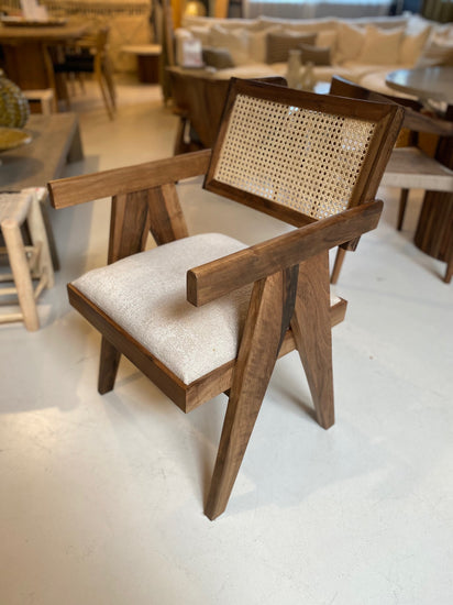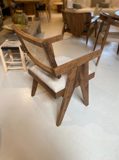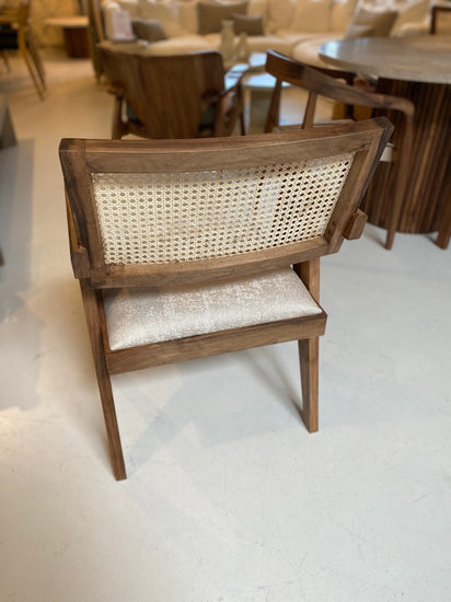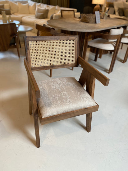 L’assise en tissu doux vous garantit un confort optimal, tandis que le cannage artisanal et la structure en bois de noyer massif soulignent son caractère authentique et durable.