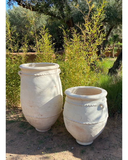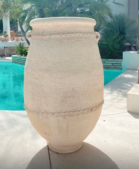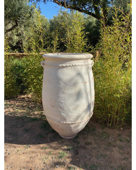 La jarre Sahraoui, réalisée en terre cuite blanchie à la chaux, allie authenticité et élégance grâce à ses courbes arrondies.
